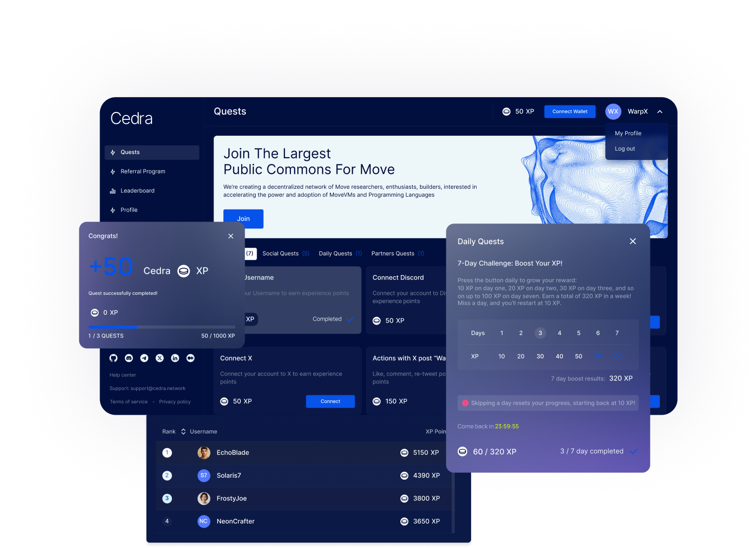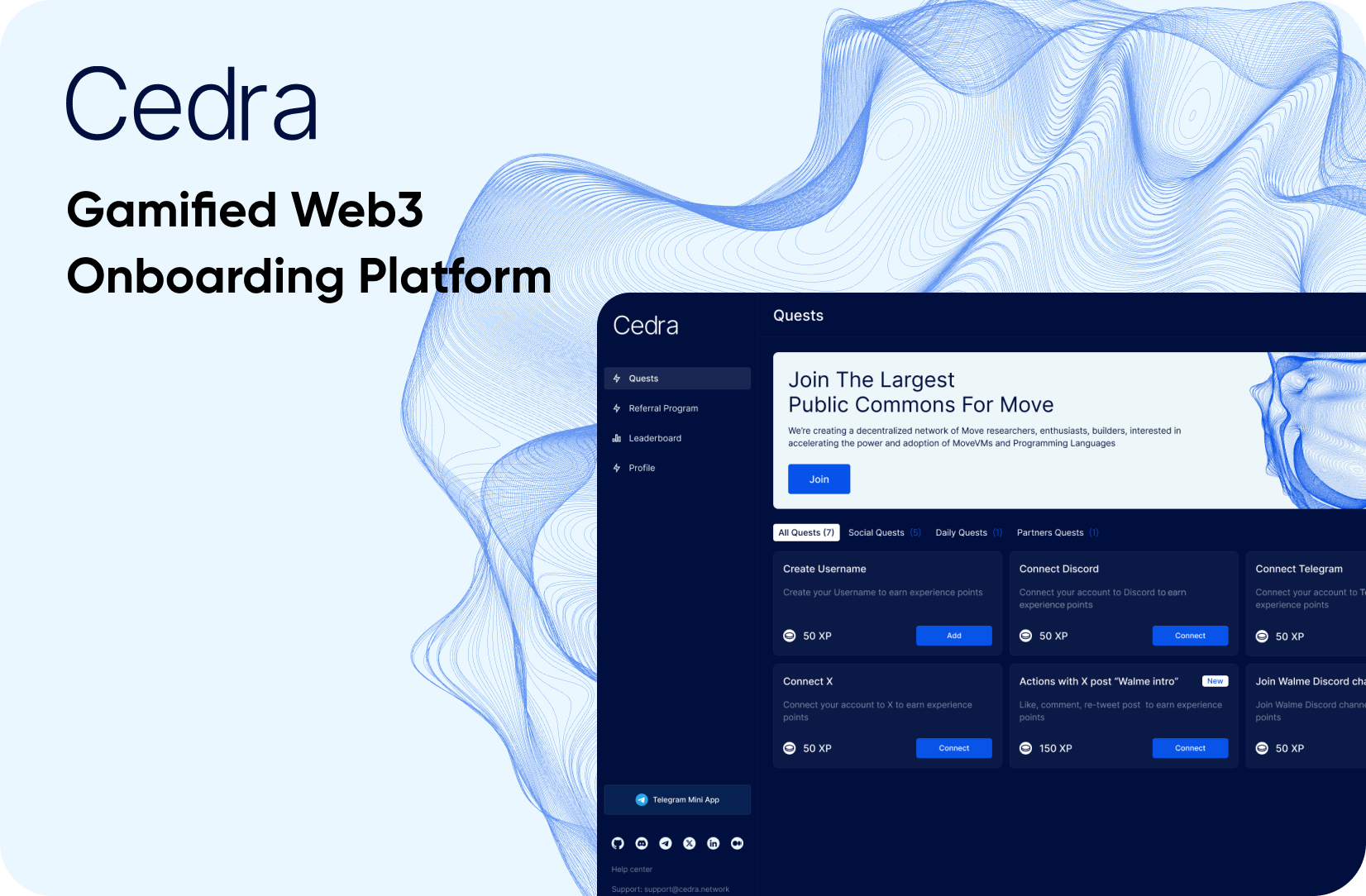 Cedra is a next-generation community engagement platform built for the Move ecosystem. It transforms user participation into a gamified experience through quests, rewards, XP progression, and wallet-based identity. By combining Web3 mechanics with a polished UX, Cedra enables projects to attract, activate, and retain contributors more effectively. The platform allows users to complete social, partner, and in-app quests, earn Cedra XP, climb leaderboards, and unlock special rewards.